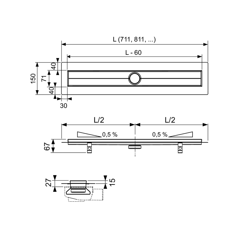 Tiesus latakas su flanšu ir sandarinimo juosta Seal System, skirtas montuoti betone, sandarinimo juosta kartu su tepama hidroizoliacija sudaro nepriklausomai išbandytą sujungimą.